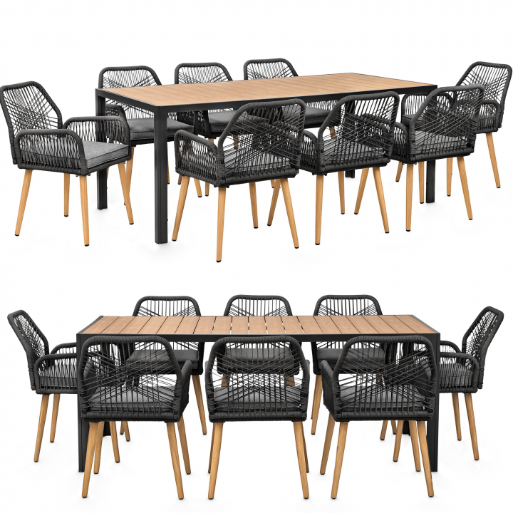 Ein echtes Highlight bildet der großzügige Esstisch mit robuster WPC-Tischplatte. Sie vereint die natürliche Holzoptik mit den Vorteilen eines modernen Verbundwerkstoffes: pflegeleicht, wetterfest und dauerhaft schön. Das hochwertige Gestell aus pulverbeschichtetem Stahl ist kratzfest, rostfrei und rundet das Gesamtbild elegant ab.