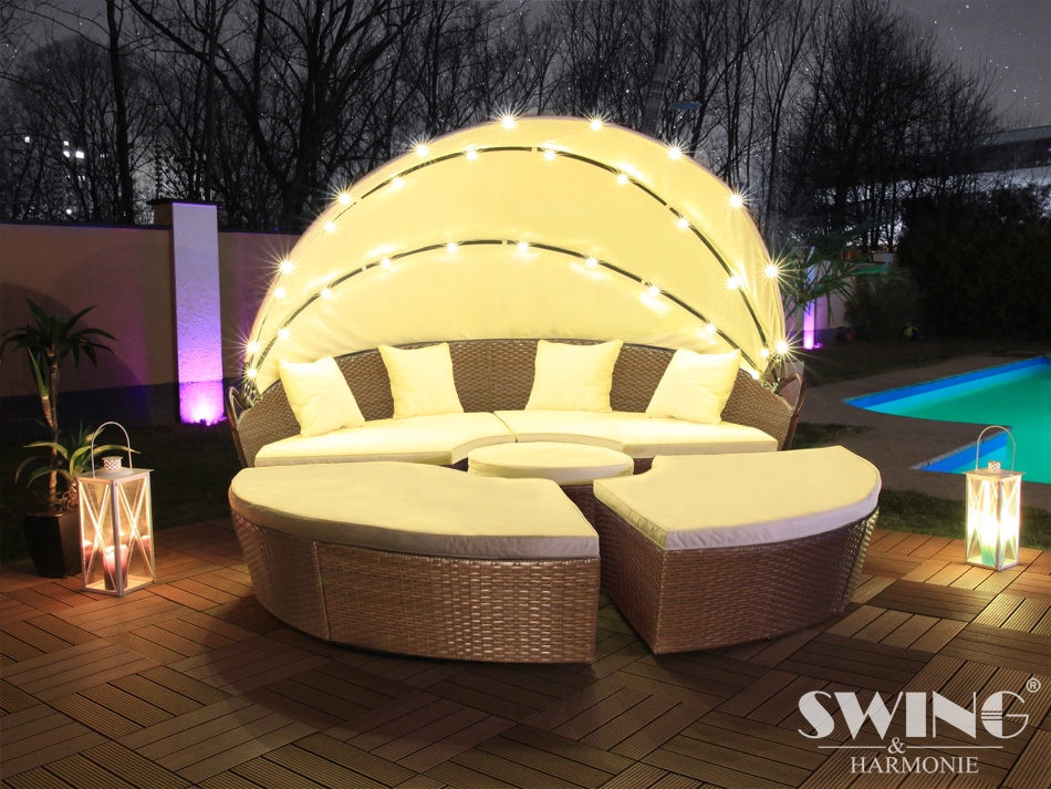 Diese moderne Sonneninsel der Marke Swing&Harmonie® aus hochwertiger Polyrattanfaser kann dank der modularen Bausweise als große Lieferfläche, sowie als Sitzgruppe für mehrere Personen genutzt werden. Die Polyrattanfaser wurde von Hand auf einen pulverbeschichteten Rahmen geflochten. Sie ist äußerst wetterresistent, pflegeleicht und trotzt Hitze, Frost, Chlor und Salzwasser. Die Sitzauflagen können dank abnehmbarer Bezüge schnell und einfach gereinigt werden.